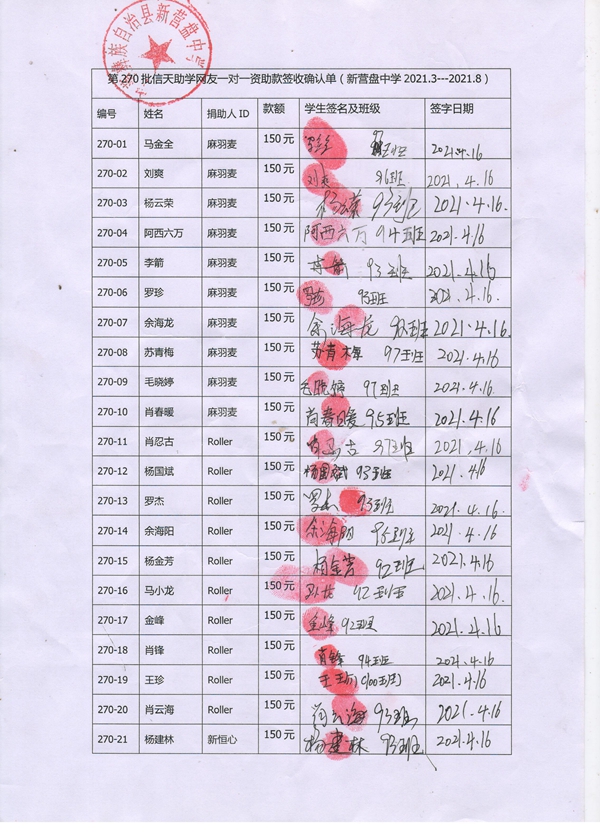 第270批新营盘中学(2021年3月到2021年8月)受助学生签收单