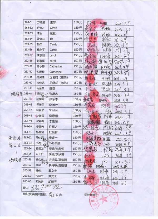 263-44杨忍干,因中途转学,资助款转给陈晓东;