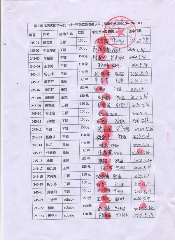 第245批蒗渠中学(2020年3月-2020年8月)受助学生签字确认单
