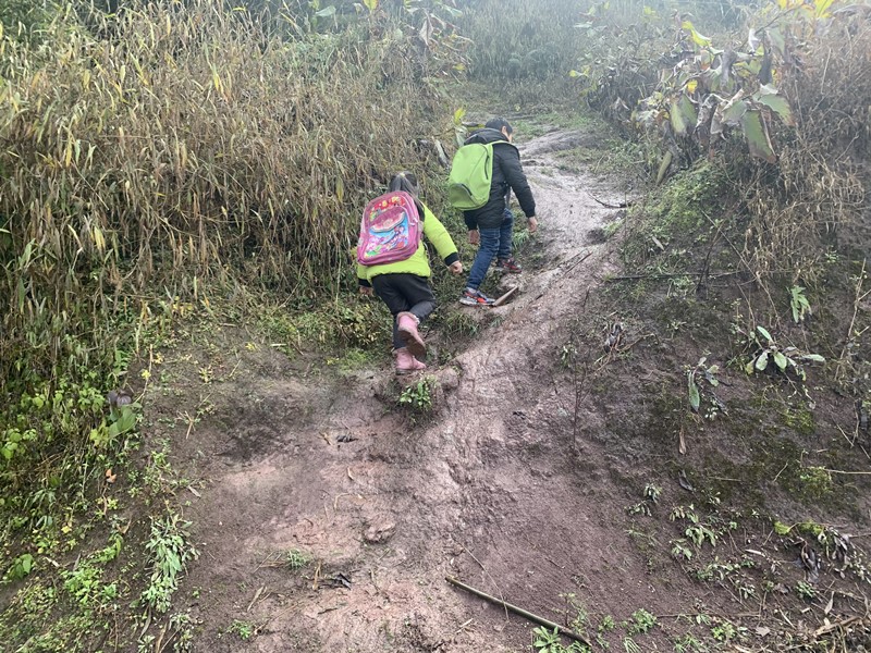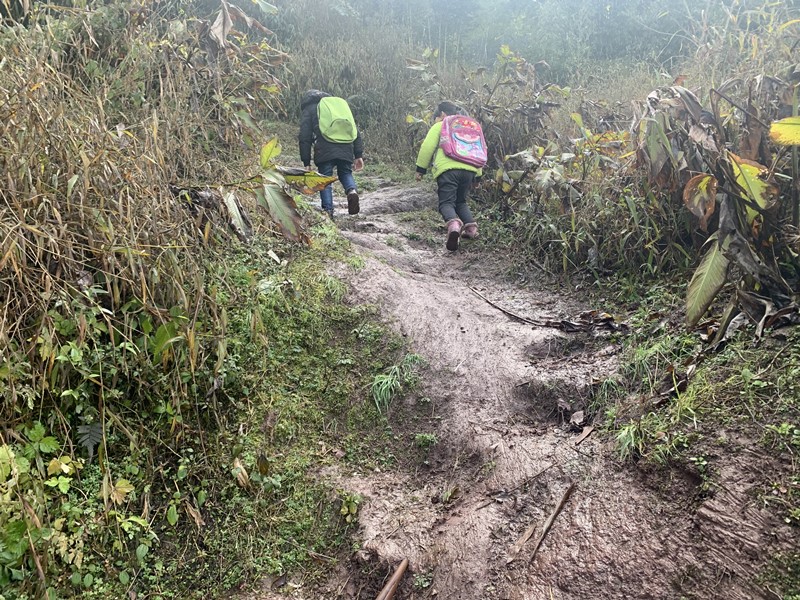 小学生上学之路,等修好了路之后,就可以坐三轮车、面包车上学了,或者骑自行车上学了。
