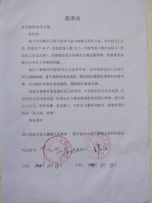 杨子坪公路位于四川省沐川县大楠镇文昌村2组,全长约2.2公里,起点:杨子坪,终点:许家湾。受益农户19户,直接受益人数72人,间接受益人数约650人(周边的人也走此路)。此路能给老百姓解决交通运输困难,更重要的是解决小学生上学难的问题。村民修路决心很大,全力集资,350元/户,共集资6650元,计划修通土路、支路、涵管、并铺设部份路面块石,力争雨季也能通车。