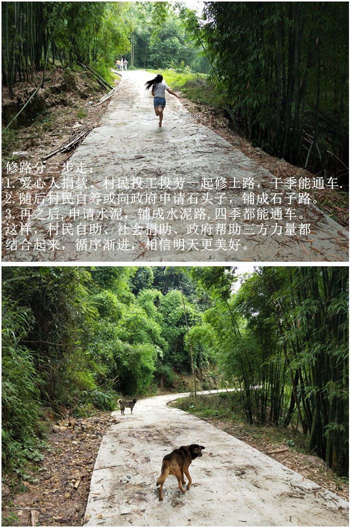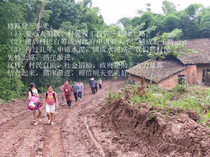 修路分三步走:1.爱心人捐款、村民投工投劳一起修土路,干季能通车;2.随后村民自筹或向政府申请石头子,铺成石子路,一般雨季也能通车;3.再之后,申请水泥,在政府帮助下铺成水泥路,四季都能通车。这样,村民自助、社会捐助、政府帮助三方力量都结合起来,循序渐进。
