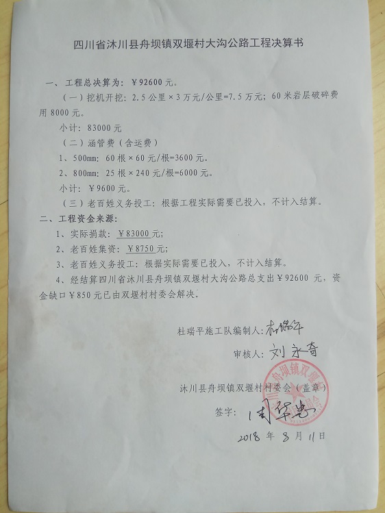 (5)修路预算分好几部分,有挖掘机、涵管、炸药爆破(山崖需要爆破)、堡坎、村民义务工、征地等。修路,我们不全包,我们出一大部分钱:挖掘费用、山崖爆破等。村民出义务工、涵管、征地费、村民小额集资。