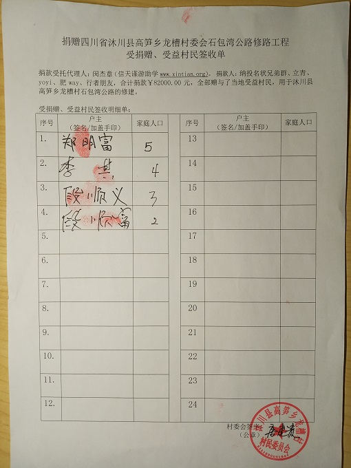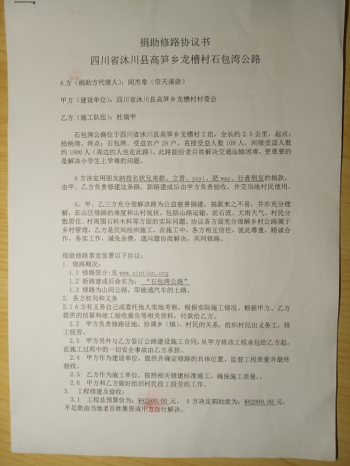 (1)爱心人捐款、村民投工投劳一起修土路,干季可以通车;