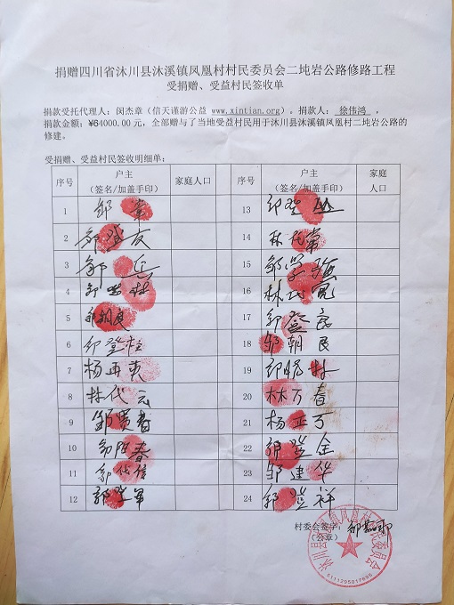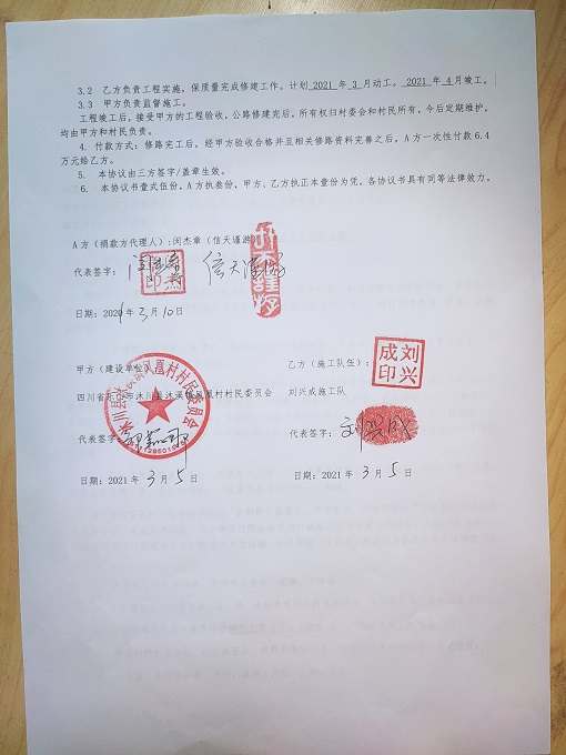 (5)修路预算分好几部分,有挖掘机、涵管、炸药爆破(山崖需要爆破)或者岩石破碎、堡坎、村民义务工、征地等。修路,捐款方不全包,捐款方出一大部分钱:挖掘费用、部分山崖爆破(如有的话)或破碎等。村民出义务工、涵管、征地费、或部分破碎费用,村民小额集资。