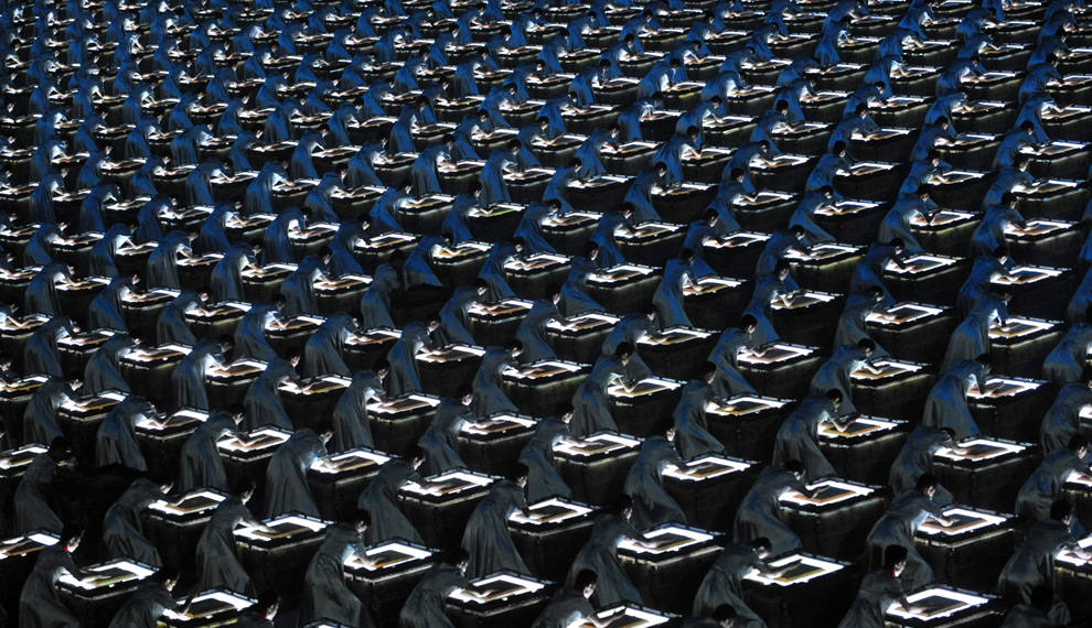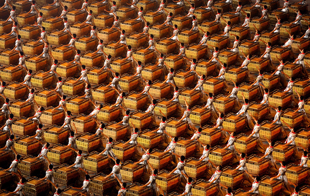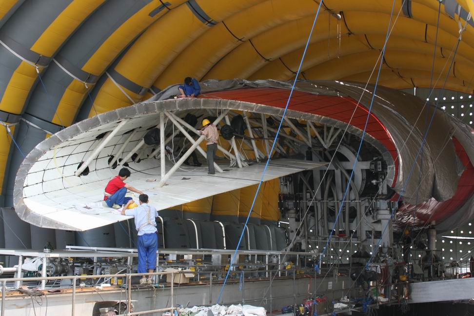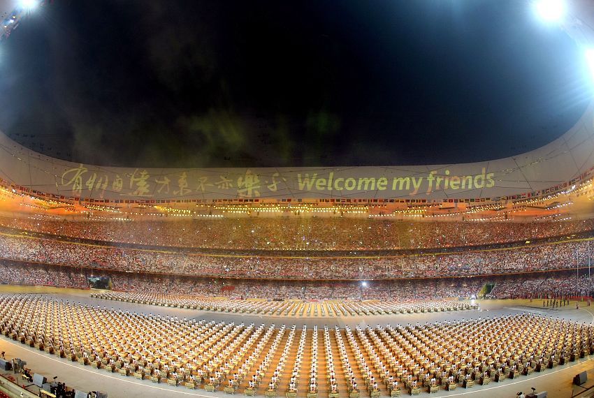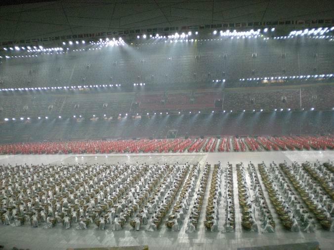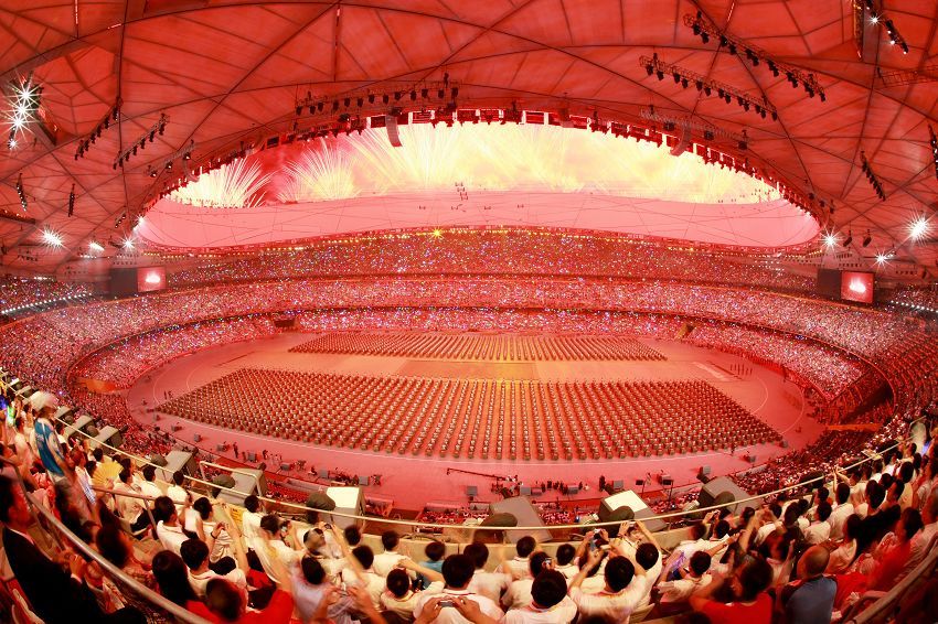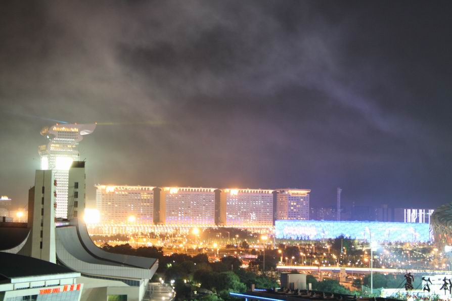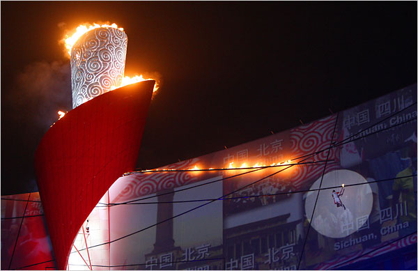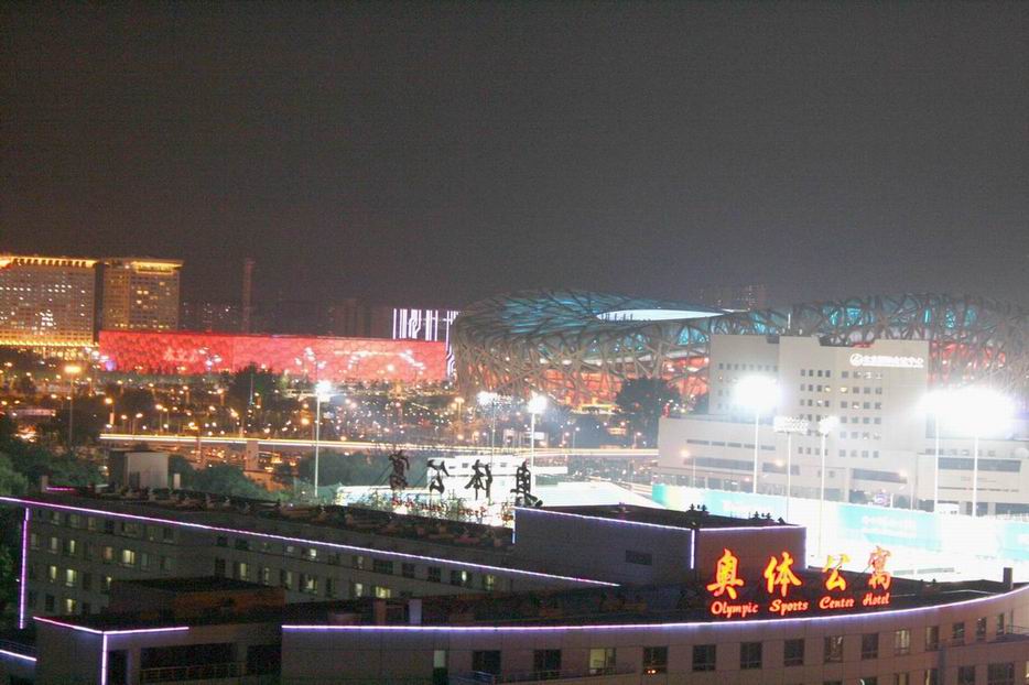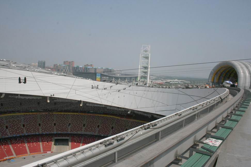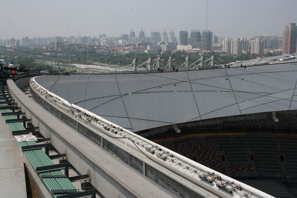 吊李宁的屋顶铁架子...沿着鸟巢顶部的轨道滑行一周.