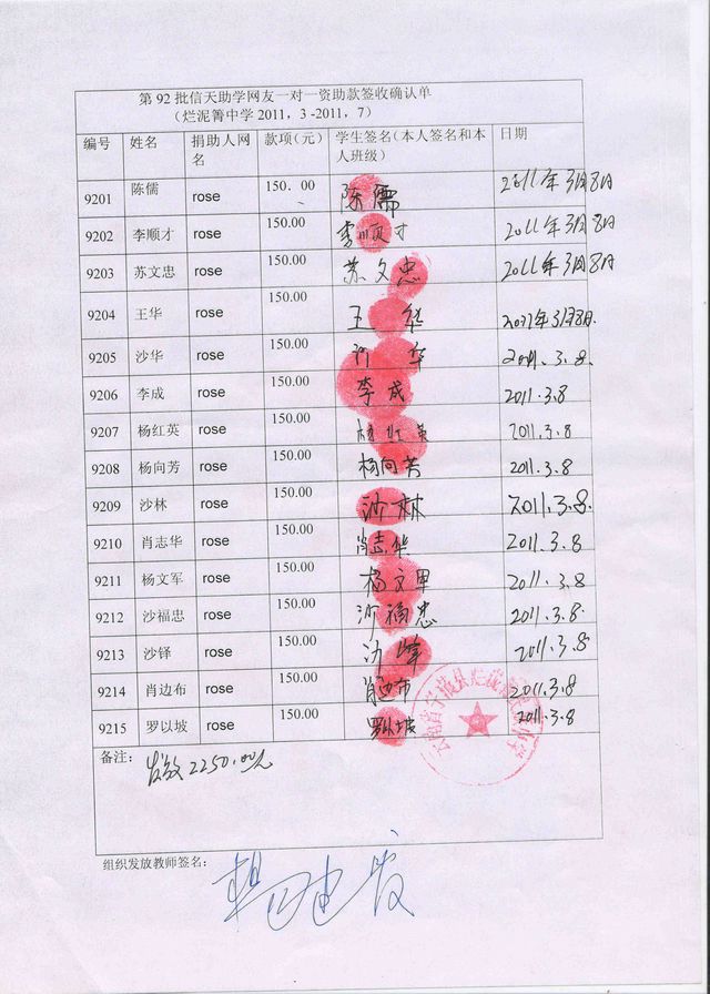 烂泥箐中学第92批(2011年3月-2011年7月)信天助学款发放签名表