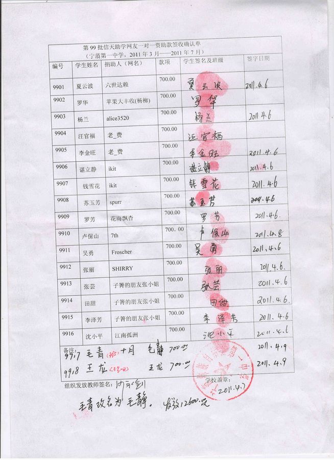 宁蒗一中99批(2011.3-2011.7)受助学生签字确认单