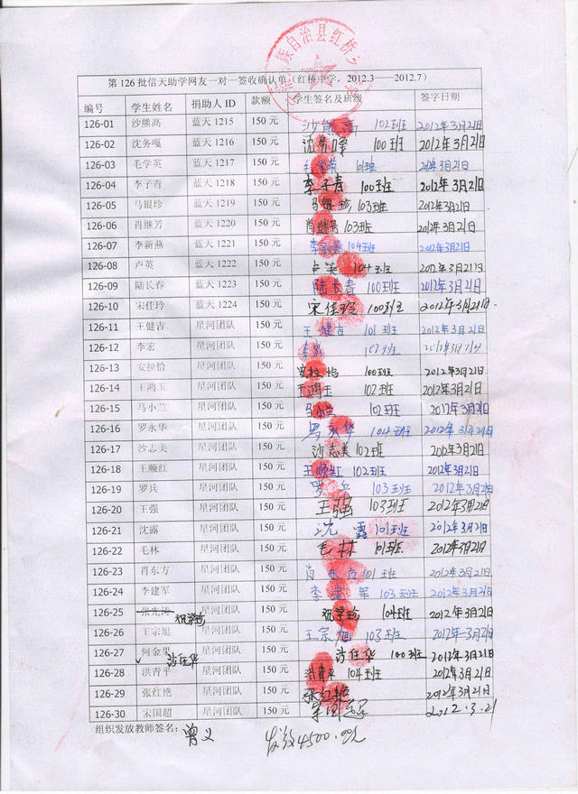 第126批红桥中学(2012.03--2012.07)受助生签收确认单