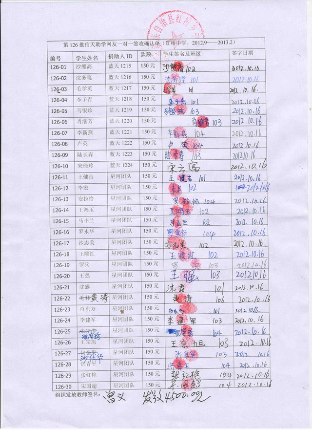 红桥中学126批(2012年9月到2013年2月)受助学生签收单