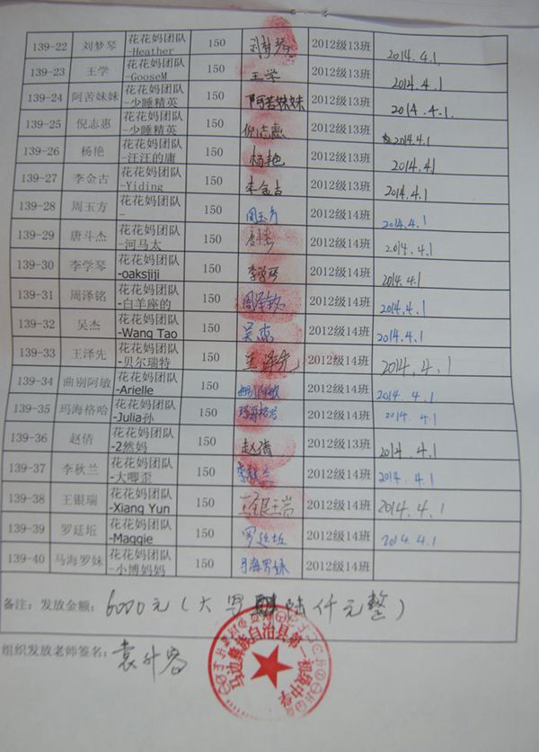 第139批马边第一初中(2014年3月-2014年7月)信天助学款发放签收单