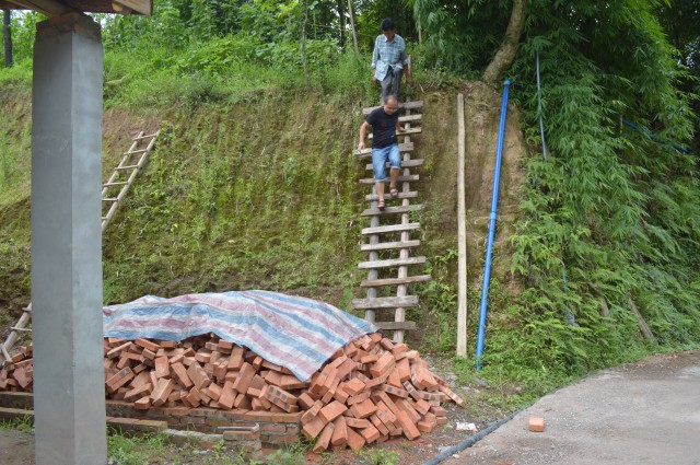 蓄水池修在这道坎上边的树林里,工人搭了一个简易的梯子.