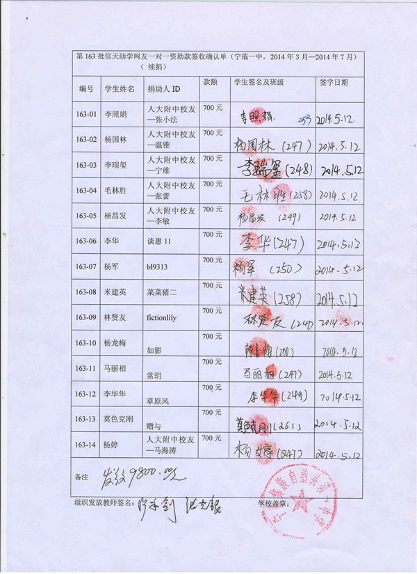 第163批宁蒗一中(2014年3月-2014年7月)受助生签收单