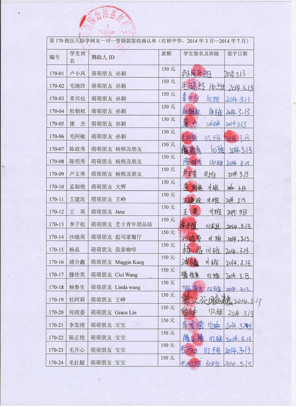 第170批红桥中学(2013年9月-2014年2月)受助生签收单