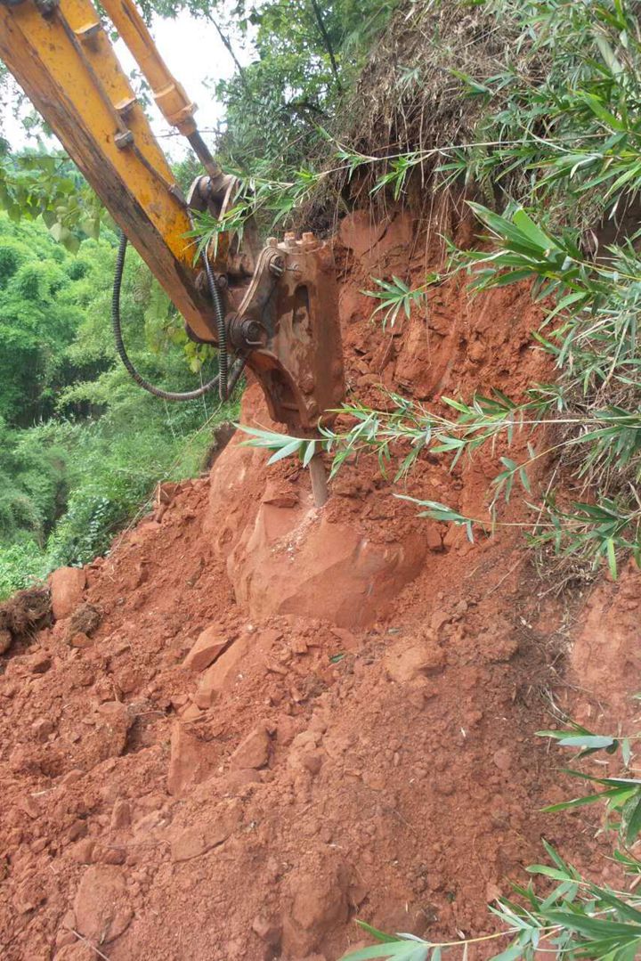 9日下午雨停,挖掘机刚开始工作,一震动,两块大石头(约20吨重)塌翻掉下来,把正准备实施破碎爆破的地方,砸成了一个大陡坡,差一点就砸到挖掘机。