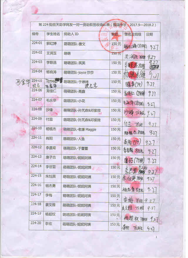 第224批蒗渠中学(2017年9月-2018年2月)受助学生签字确认单