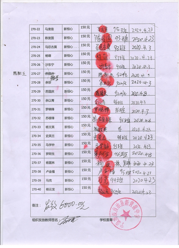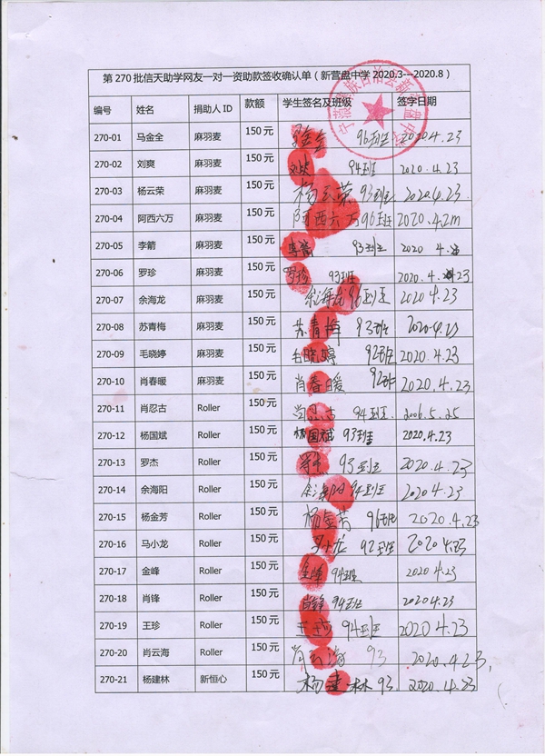 第270批新营盘中学(2020年2月到2020年8月)受助学生签收单
