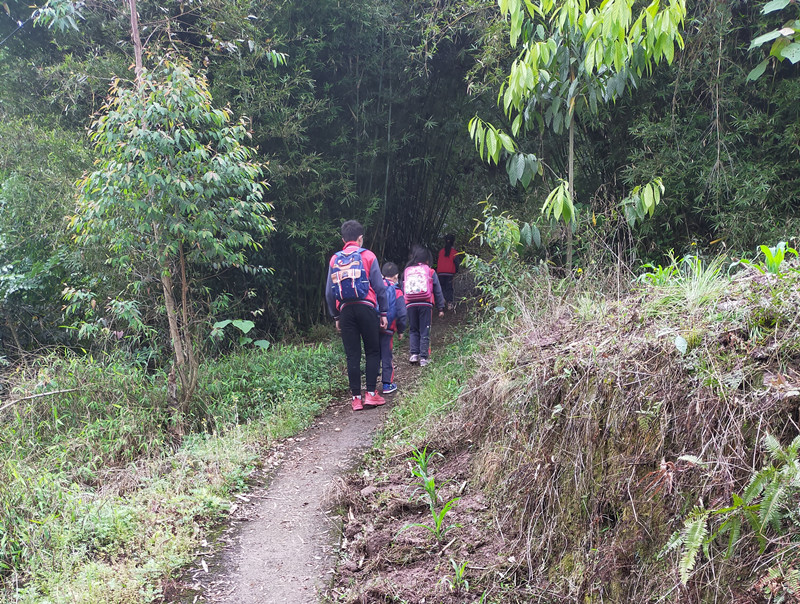 小学生上学之路,等修好了路之后,就可以坐三轮车、面包车上学了,或者骑自行车上学了。