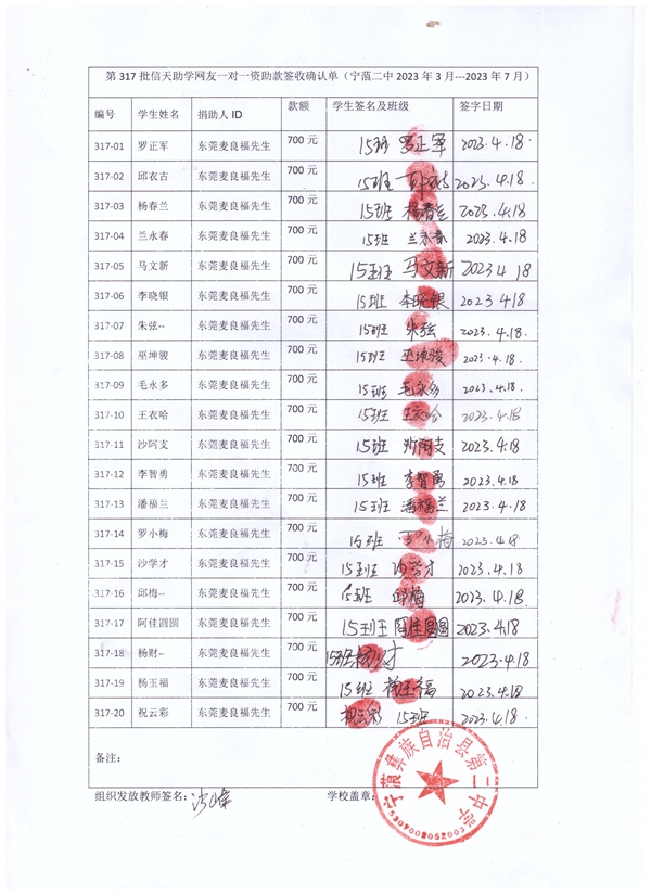 第317批宁蒗二中(2023年3月-2023年7月)受助学生签收单