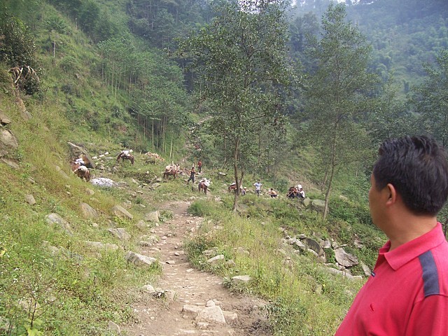 他们准备先到较远的土坝村校,而马队是往高山上的十二坝村校工地运送物资。可以看见,刚才遇到的马队已经在爬对面的大坡了……