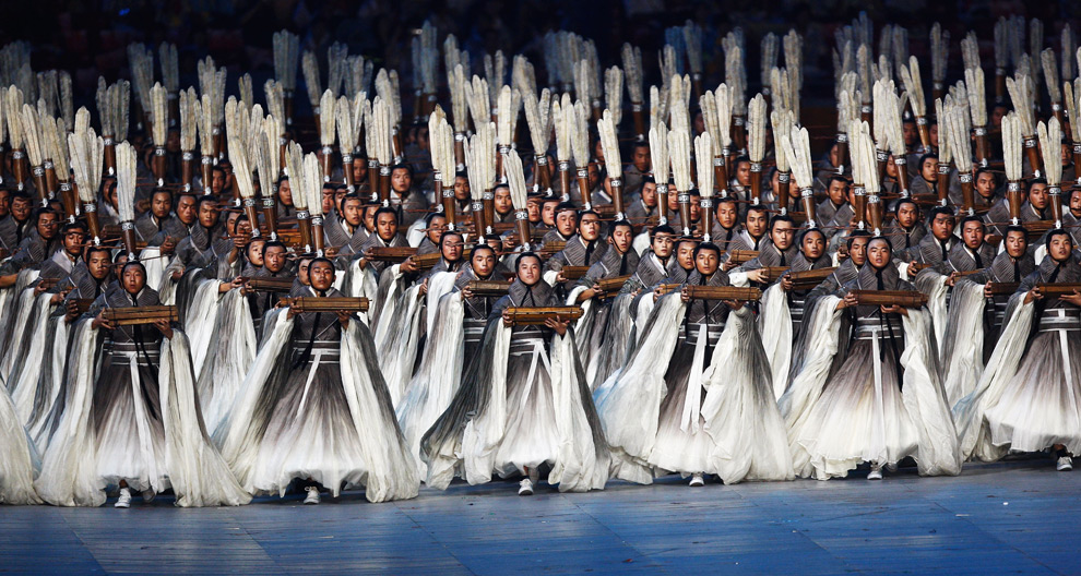孔子3000名弟子: 7月份排演时有"隶书"(内容是三字经)通过光束打在地面上,开幕式上没看到..