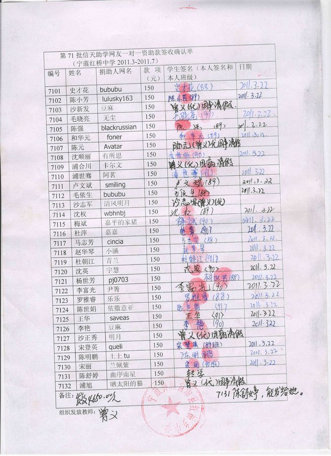 红桥中学71批(2011年3月到2011年7月)受助学生签收单: