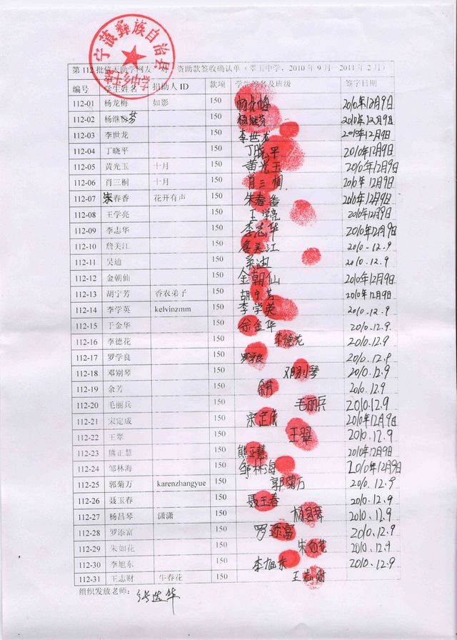 翠玉中学112批(2010年9月-2011年2月)信天助学款发放签名表