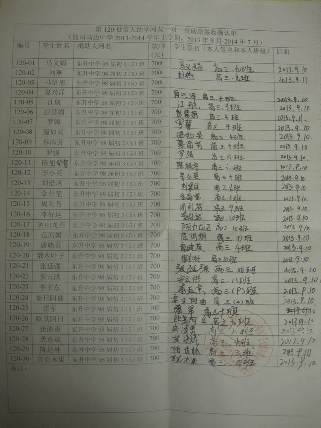 » 第120批受助生(马边中学高一30名,团捐结束,1-2期发款完毕)
