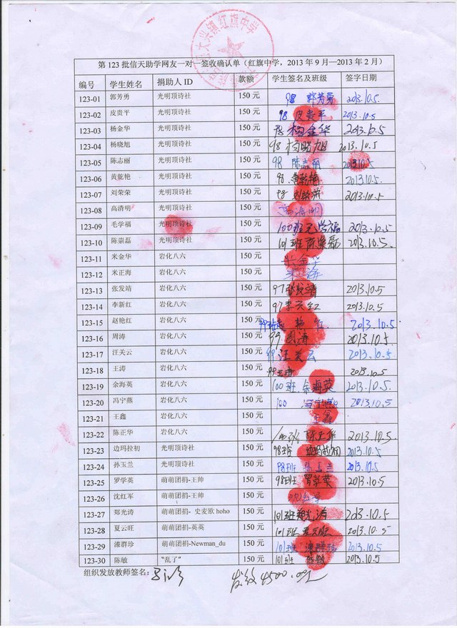 第123批红旗中学(2013年9月-2014年2月)信天助学款发放签名表