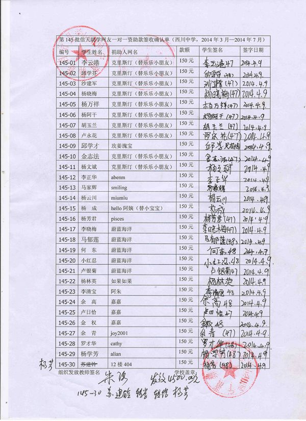 第145批西川中学(2014年3月-2014年7月)受助学生签字确认单