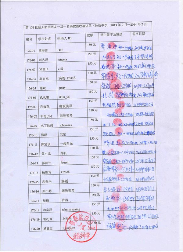 第176批拉佰中学(2013.09-2014.02)受助学生签字确认单