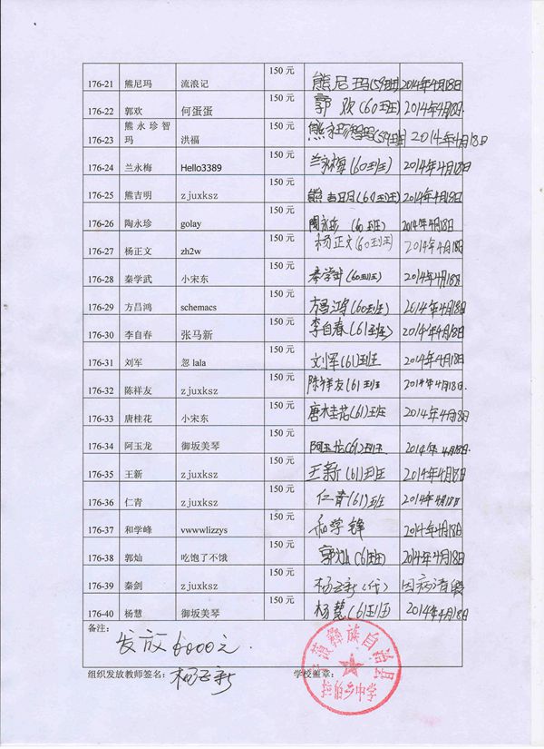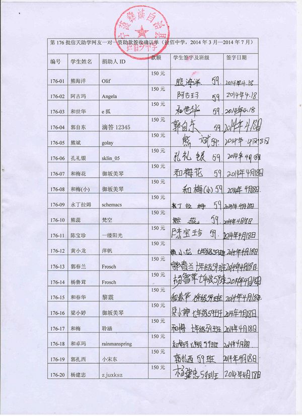 第176批拉佰中学(2014年3月-2014年7月)受助学生签字确认单