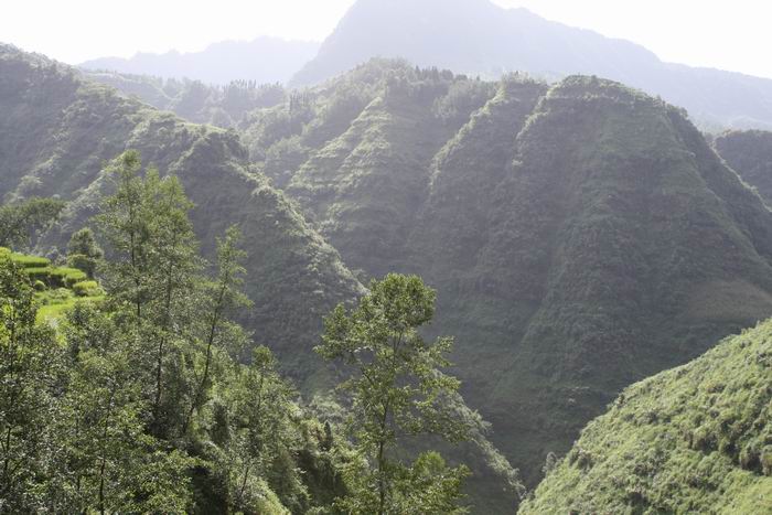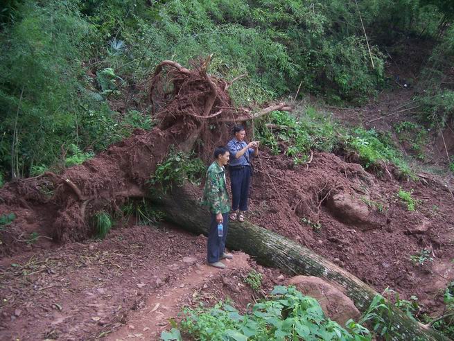 泥石流把竹子都压倒了,带泥石一起泻入河里