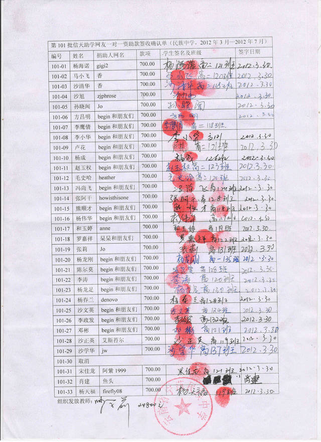 民族中学101批(2012年3月-2012年7月)信天助学款发放签名表