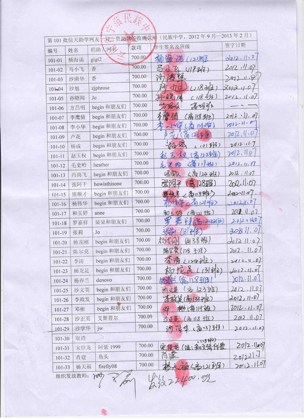 民族中学101批(2012年9月-2013年2月)信天助学款发放签名表