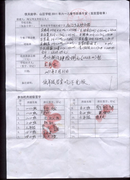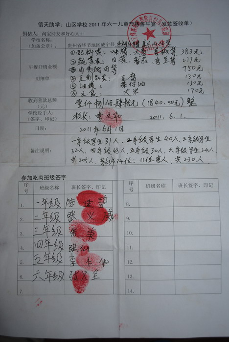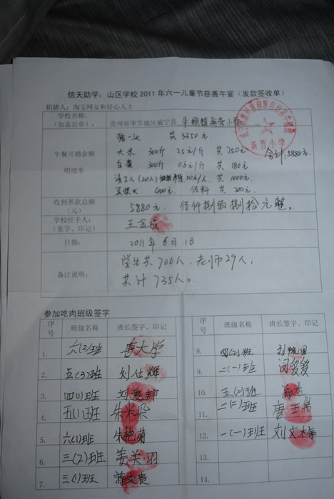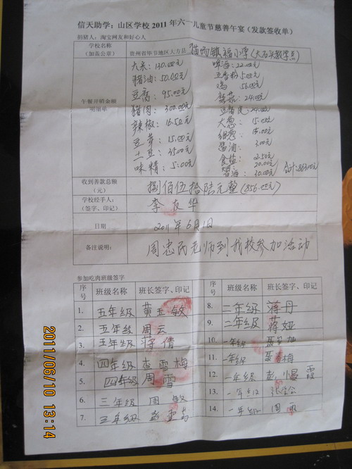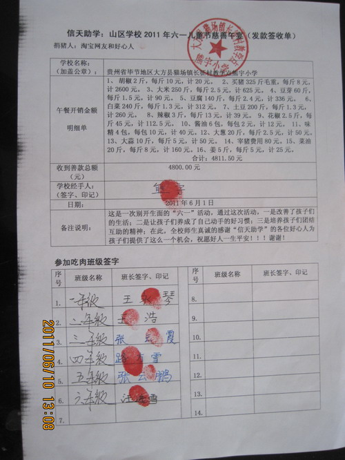 2011年"六一"慈善宴会学校签收单(贵州省)