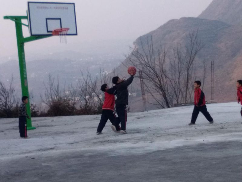 操场硬化好了,但是临江边的围墙还没有砌,孩子们已经在操场上活动了。