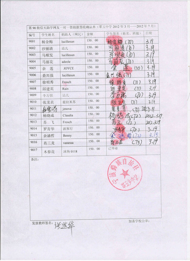 翠玉中学90批(2012年3月-2012年7月)受助学生签收确认单