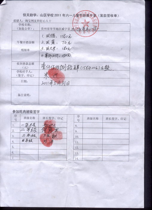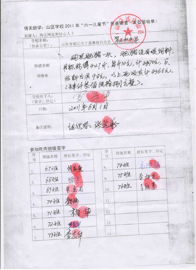 2011年"六一"慈善宴会学校签收单(云南宁蒗)