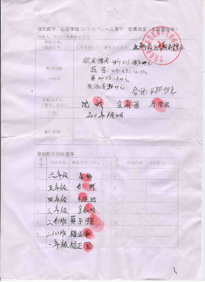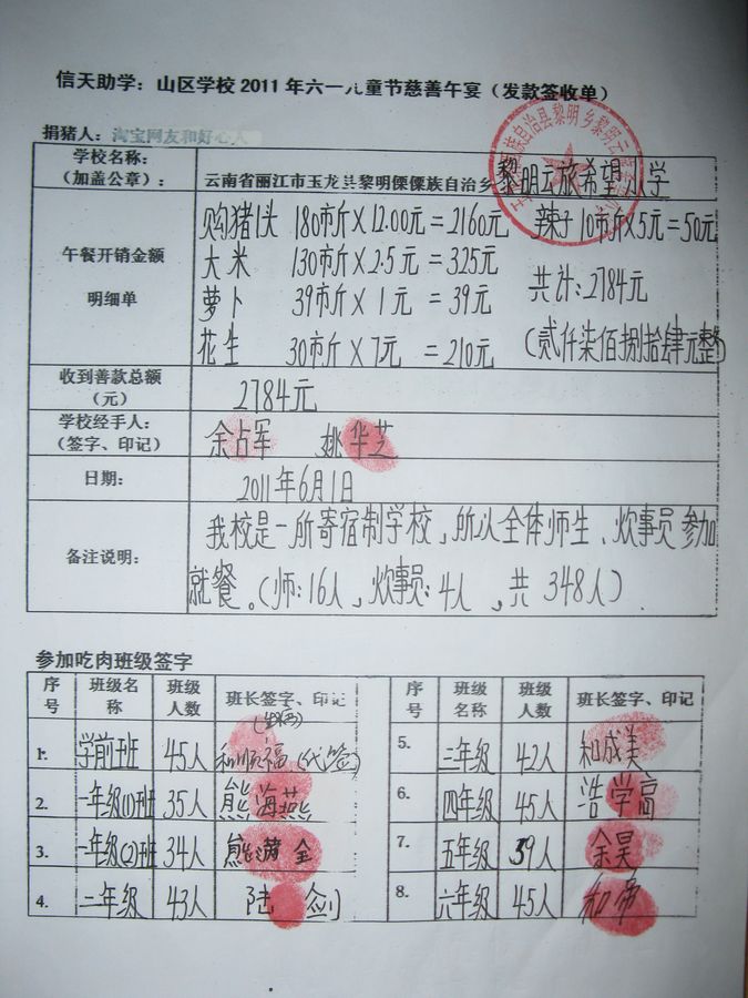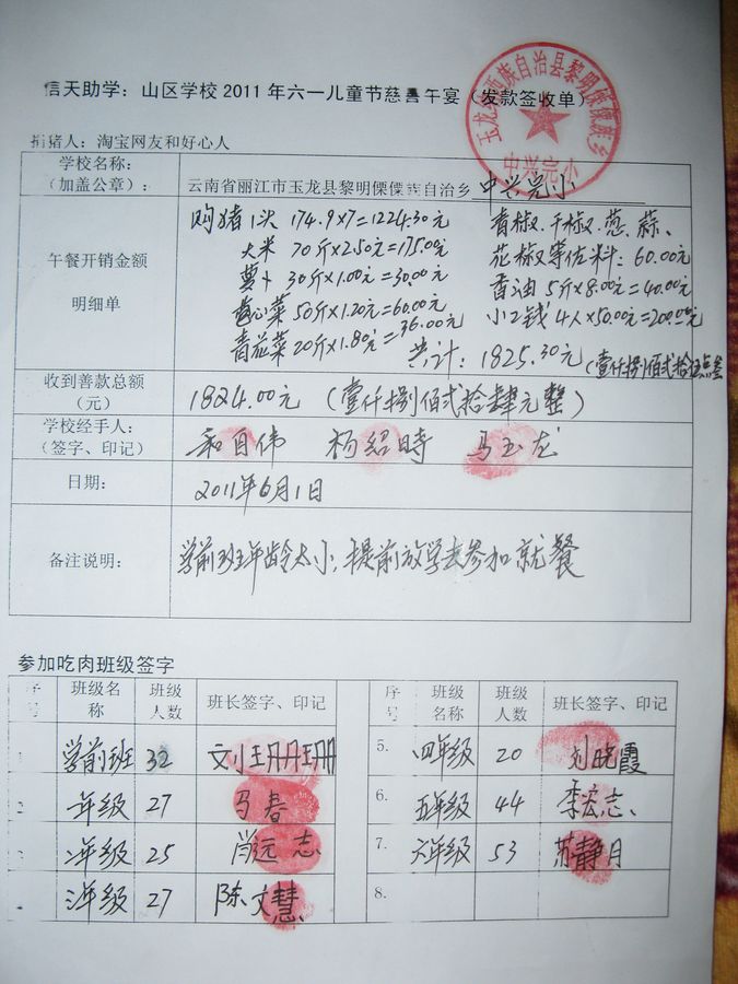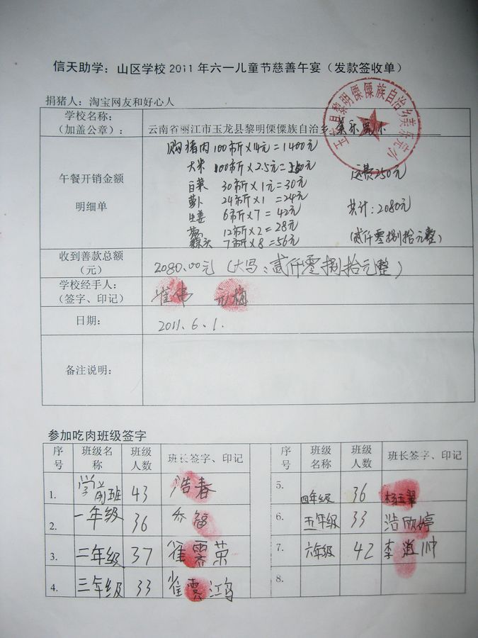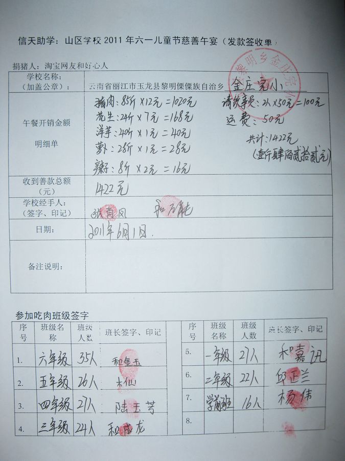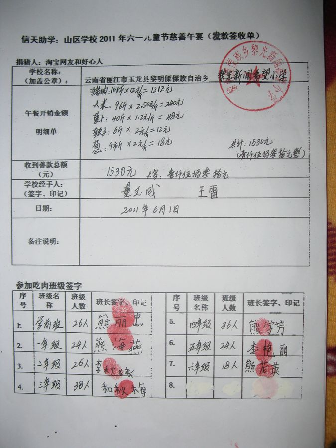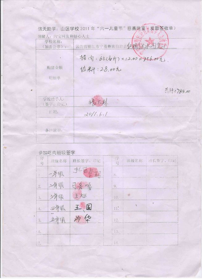 2011年"六一"慈善宴会学校签收单(云南玉龙)
