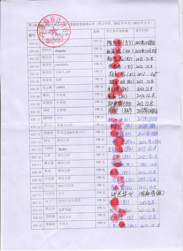 翠玉中学150批(2012年9月到2013年2月)受助学生签收单: