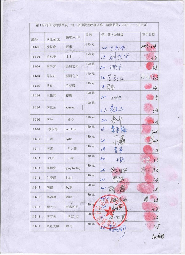 蒗渠中学第118批(2013.3-2013.8)受助学生签字确认单