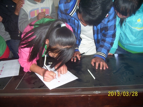 看到自己捐助的孩子签上名字,觉得很开心。