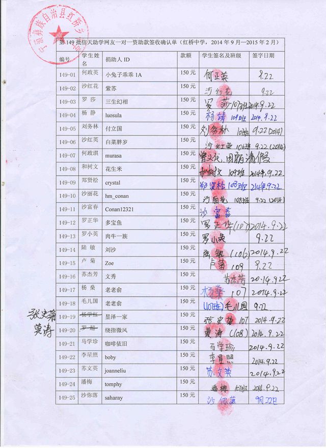 第149批红桥中学(2014年9月到2015年2月)受助学生签收单