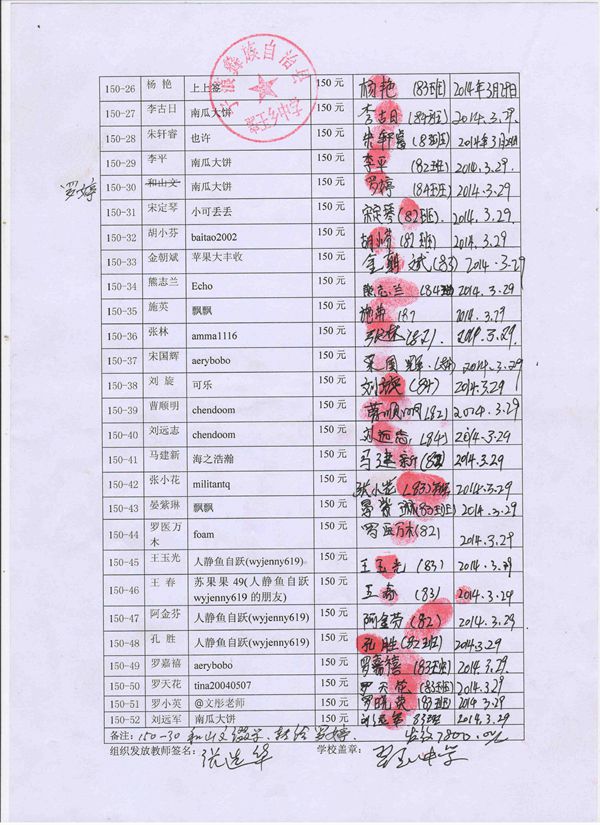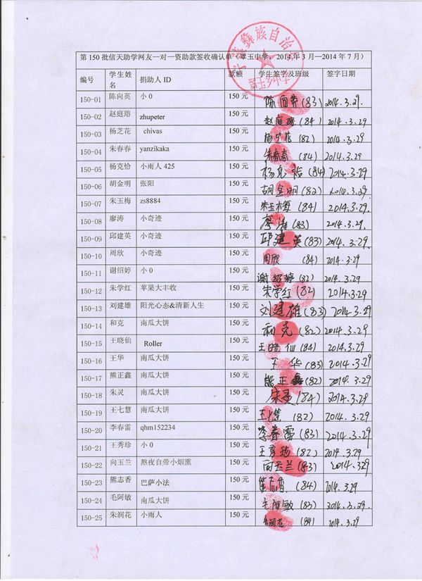 第150批翠玉中学(2014年3月-2014年7月)受助学生签收确认单