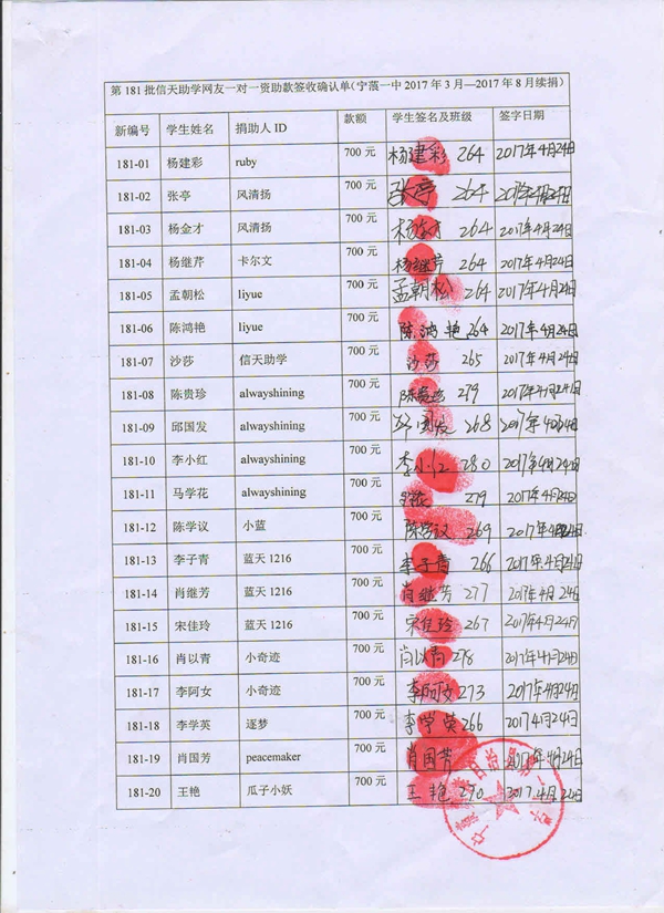 第181批宁蒗一中(2017年3月-2017年8月)受助生签收单