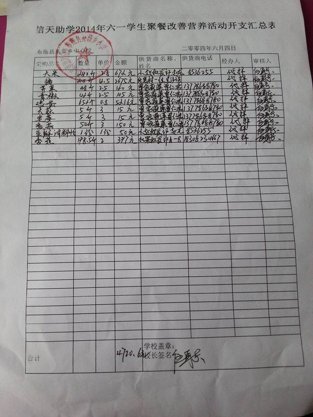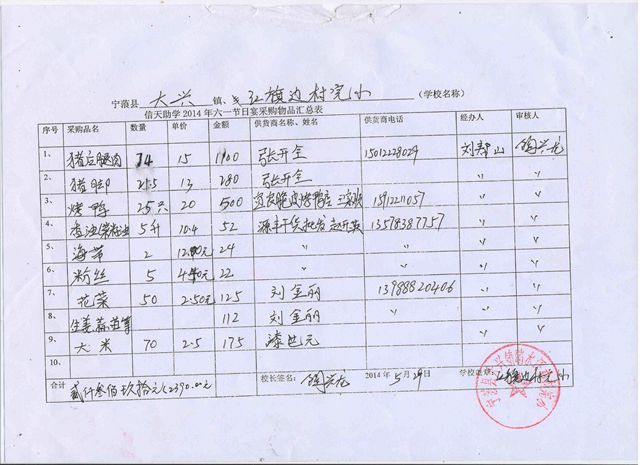 红旗中心校,边村完小2014年六一节日宴采购物品汇总表.jpg