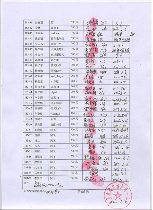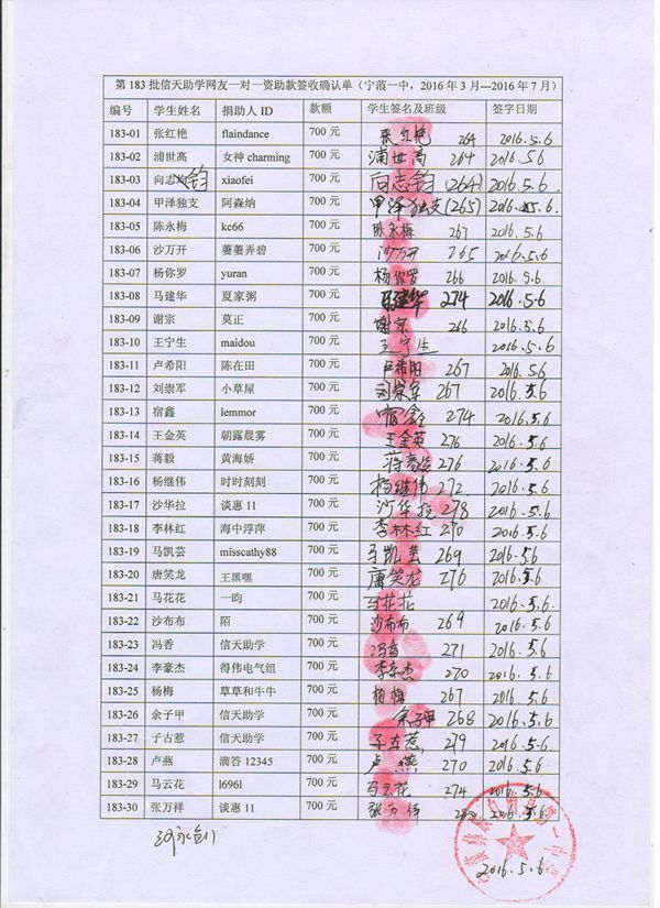 第183批宁蒗一中(2016年3月-2016年7月)受助生签收单