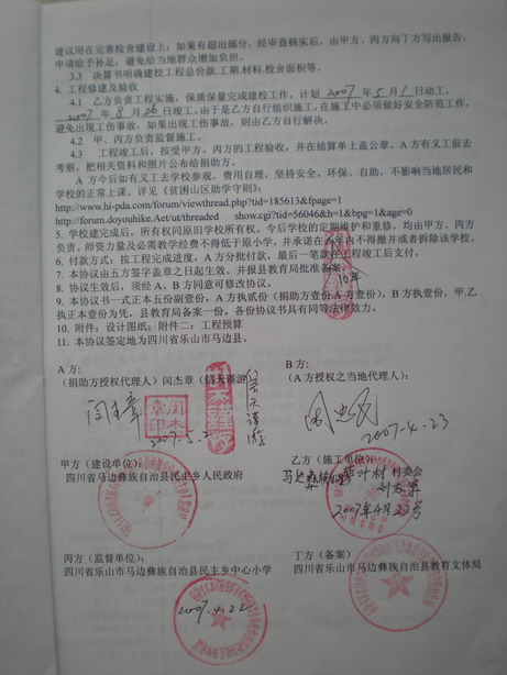 兹有驴友同行网友捐助重新修建四川乐山市马边县民主乡花椒坪小学(捐助名单及金额见最终明细单),特全权委托信天谨游(闵杰章)负责实施该校的重建,与当地相关部门及单位签署建校协议书,并将捐助修建该校所需之总款交付信天谨游(闵杰章)先生依工程进度支付之。