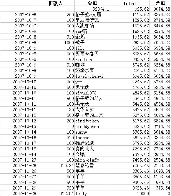 (玉米地领队xindora于2007年12月22日说明:两次筹款共筹集41138.48元,两次转款给信天共计41000元,汇款手续费合计82元,现在余款不含手续费为138.48,如果扣除手续费,余款为56.48元)